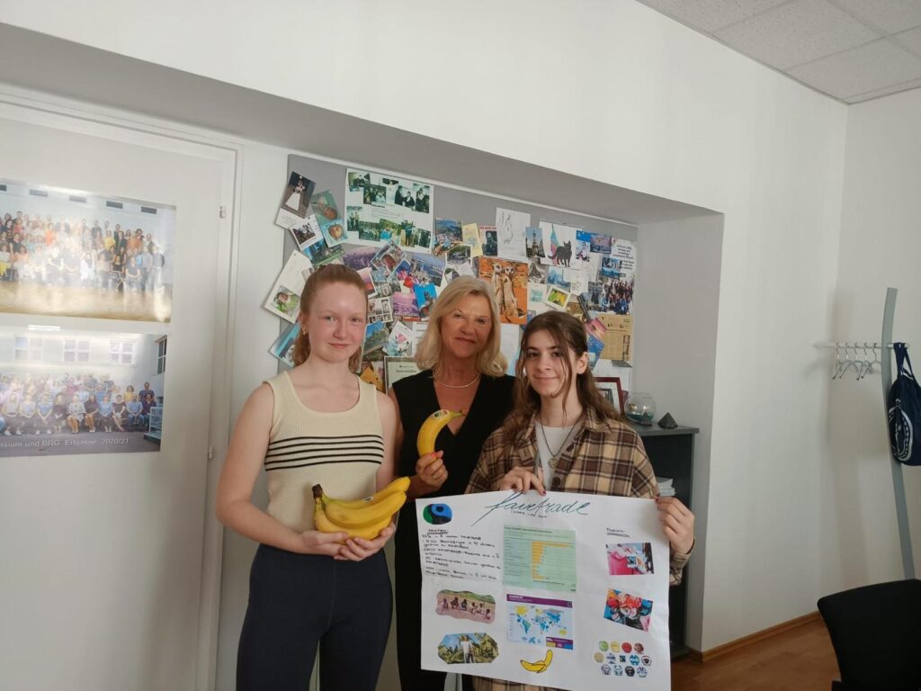 Unser Montagmorgen begann mit einer Großlieferung von 100kg Bio-Fairtrade-Bananen. Die 5B hat im Rahmen eines Projektes im Geographieunterricht für alle Schüler:innen sowie das gesamte Personal Bio-Fairtrade-Bananen bestellt. In Gruppen haben sie diese an alle verteilt. Die Schüler:innen der 5B haben sich dazu auch kreative Präsentationen, Spiele und Rätsel überlegt, um den Klassen auch einen Input über Fairtrade zu geben. Eine Schülerin war sogar im Bananenkostüm unterwegs – natürlich mit gebasteltem Gütesiegel ausgestattet!
