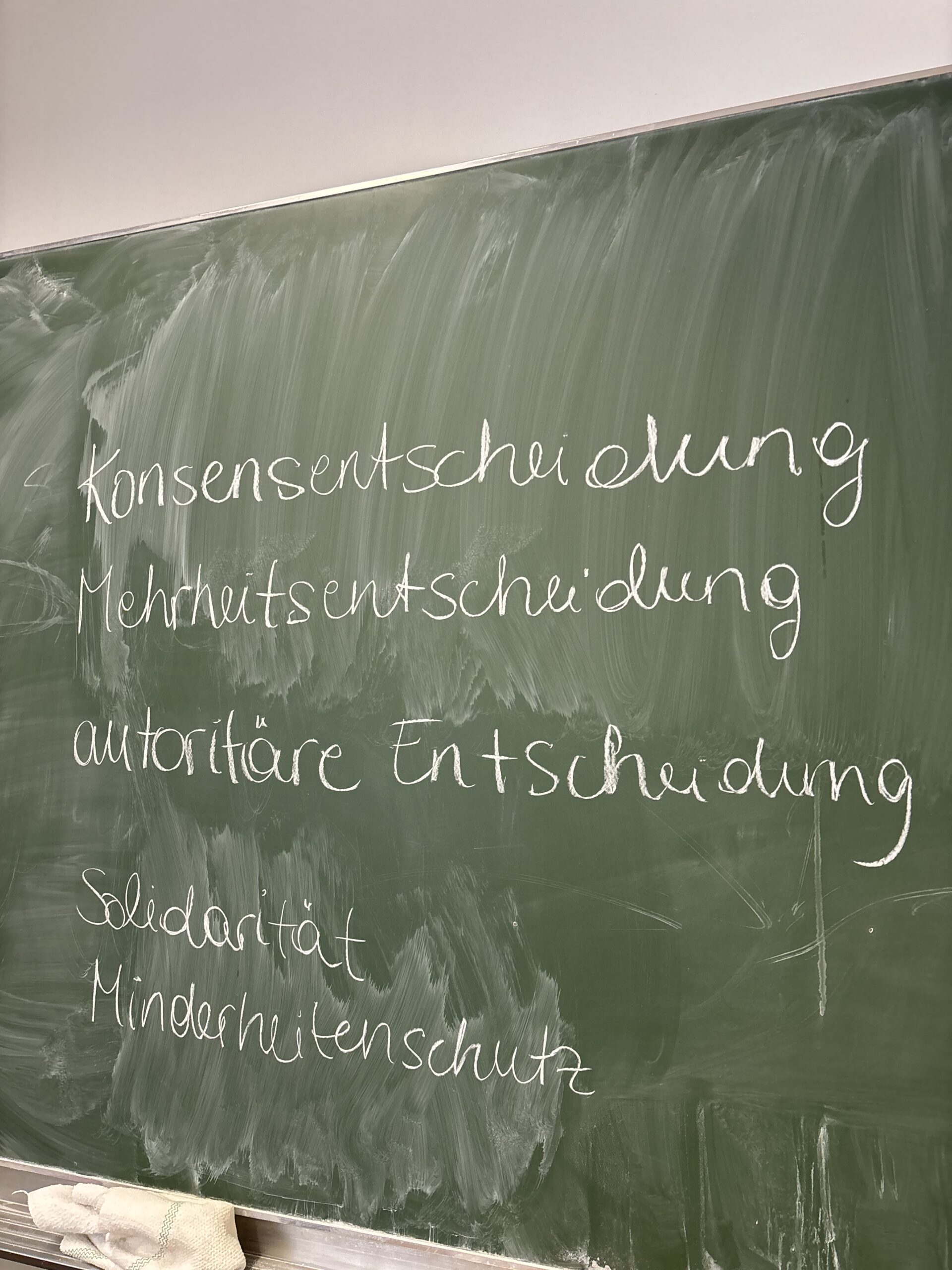 In mehreren interaktiven Fragerunden übernahmen die Jugendlichen unterschiedliche Rollen und mussten beurteilen, ob bestimmte Verhaltensweisen und Entscheidungen demokratisch sind oder nicht. Dabei wurden verschiedene Entscheidungsformen – Konsens, Mehrheit und autoritäre Vorgaben – gegenübergestellt und gemeinsam diskutiert. So wurde deutlich, welche Auswirkungen unterschiedliche Entscheidungsmodelle auf Gruppen und deren Zusammenleben haben.