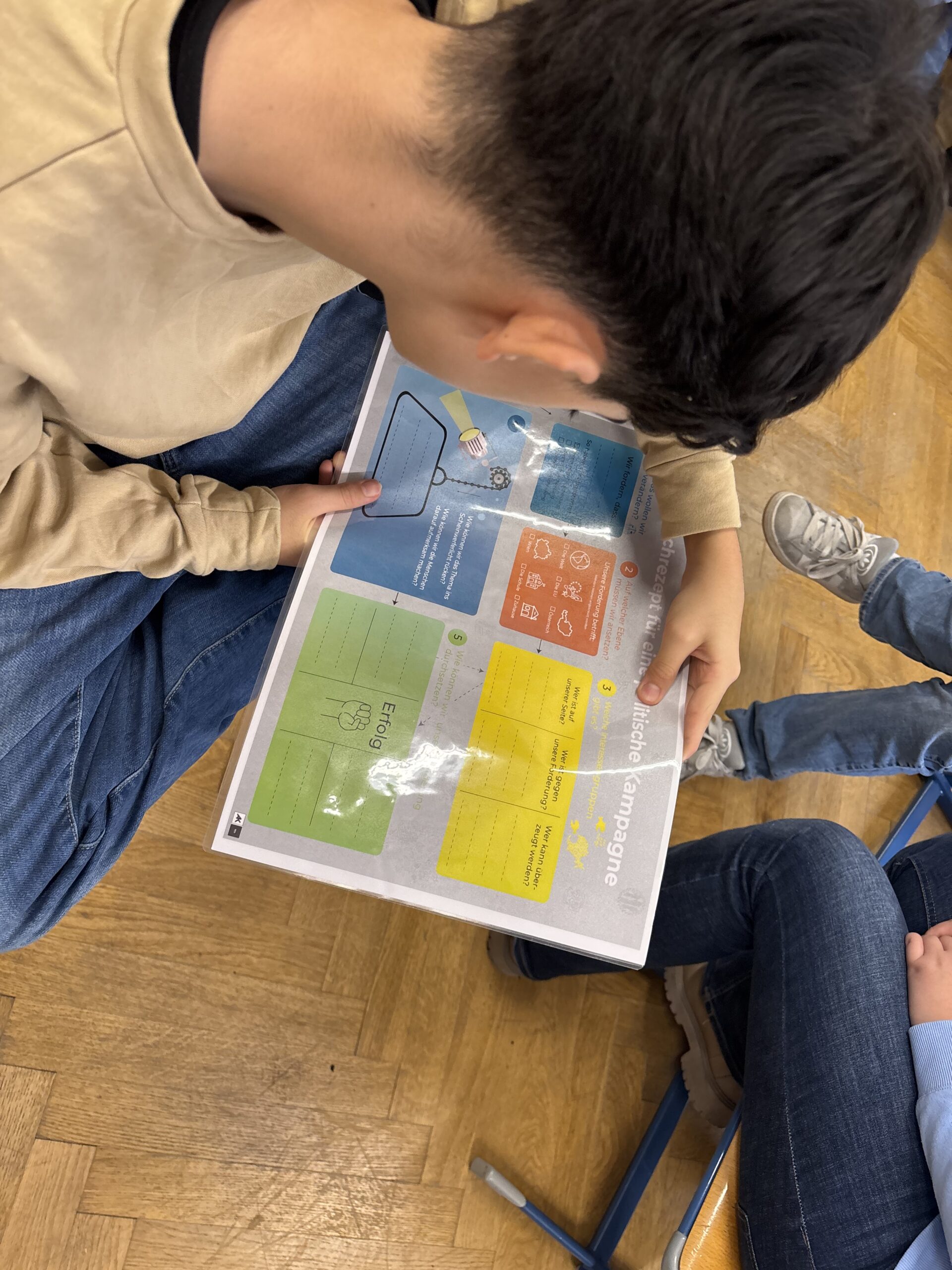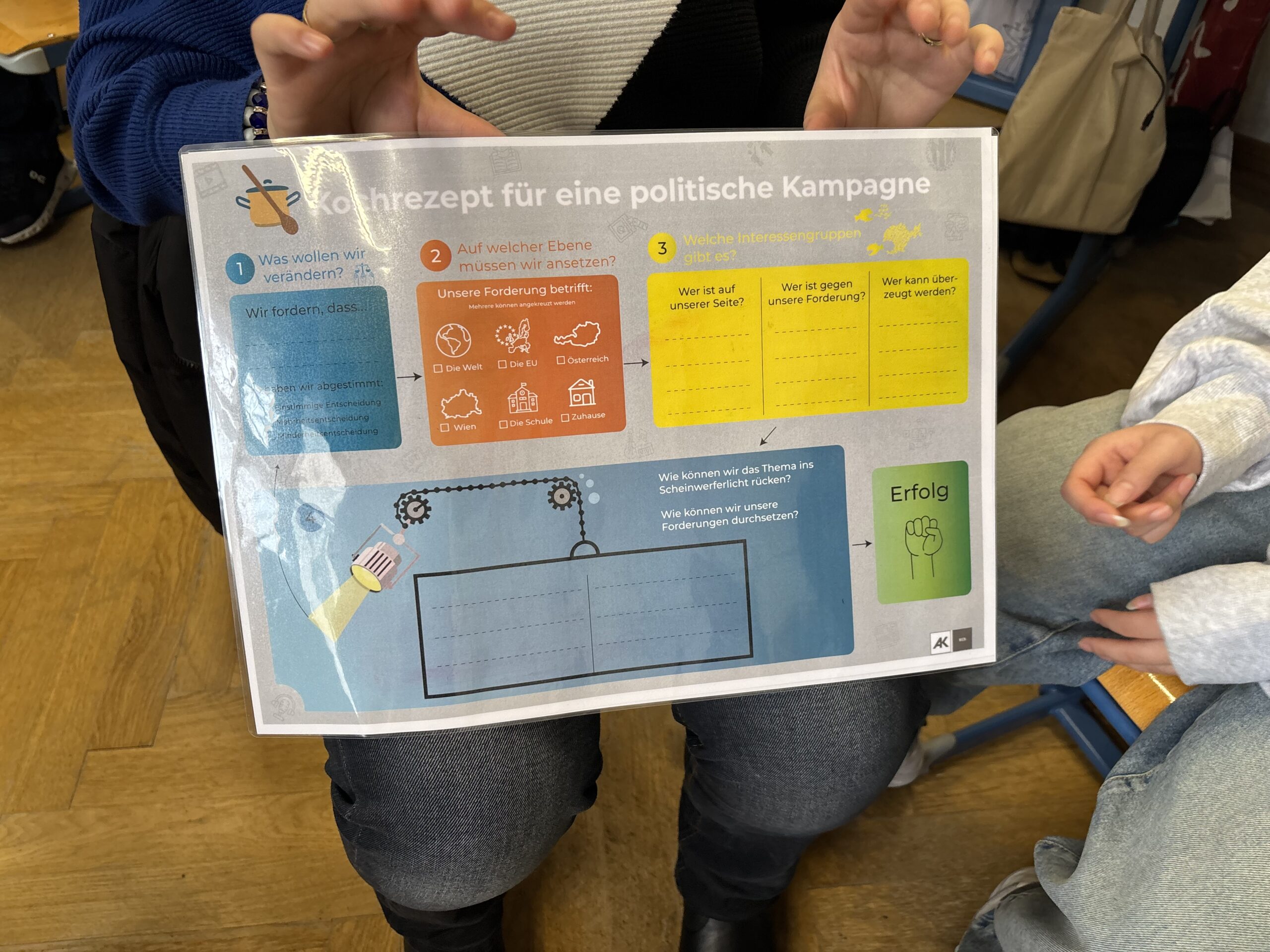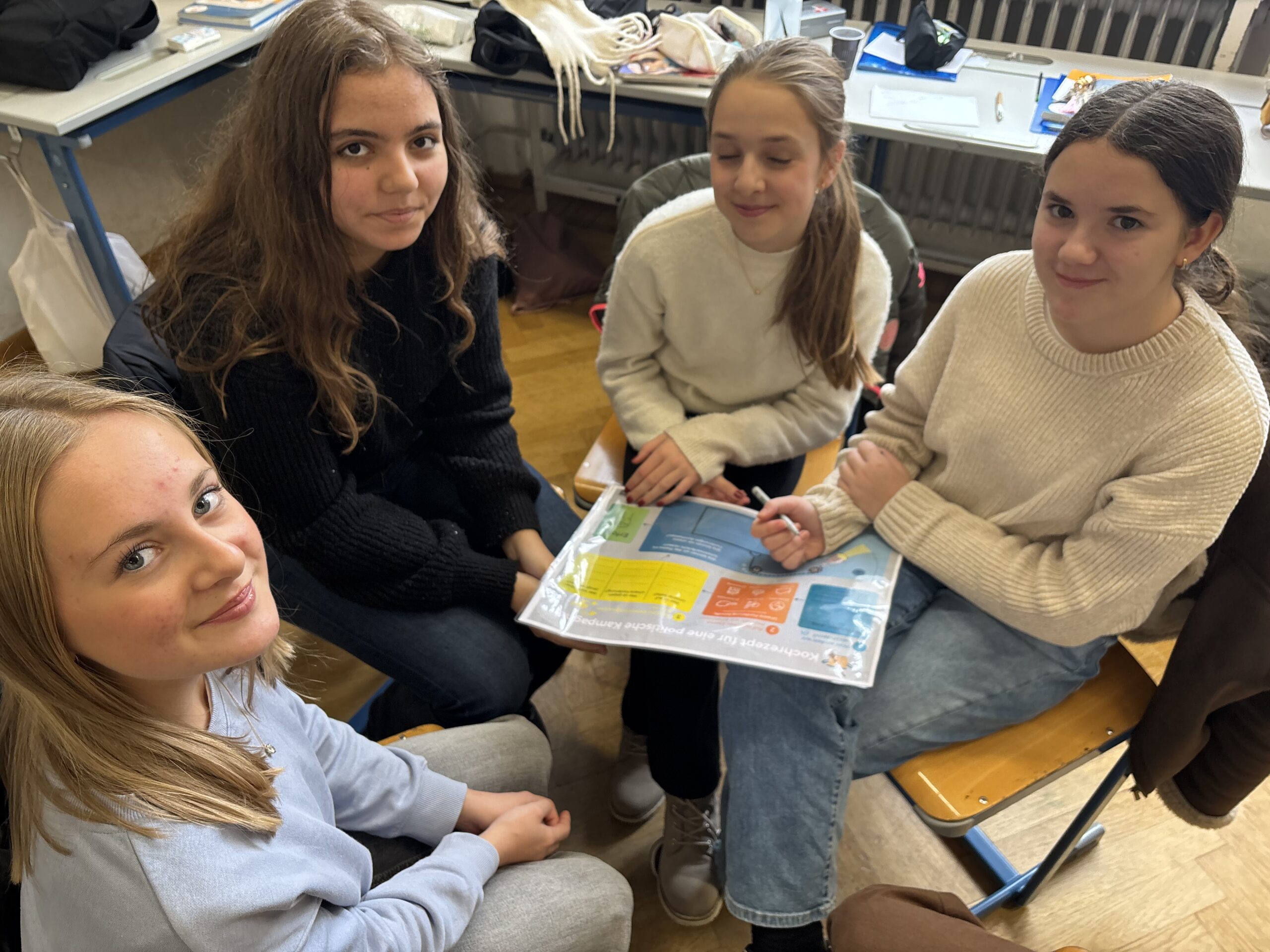 Zum Abschluss entwickelten die Schülerinnen und Schüler in Kleingruppen eigene politische Kampagnen. Sie formulierten Forderungen zu Themen, die ihnen besonders wichtig sind, und überlegten, wie sie ihre Anliegen öffentlich sichtbar machen können.