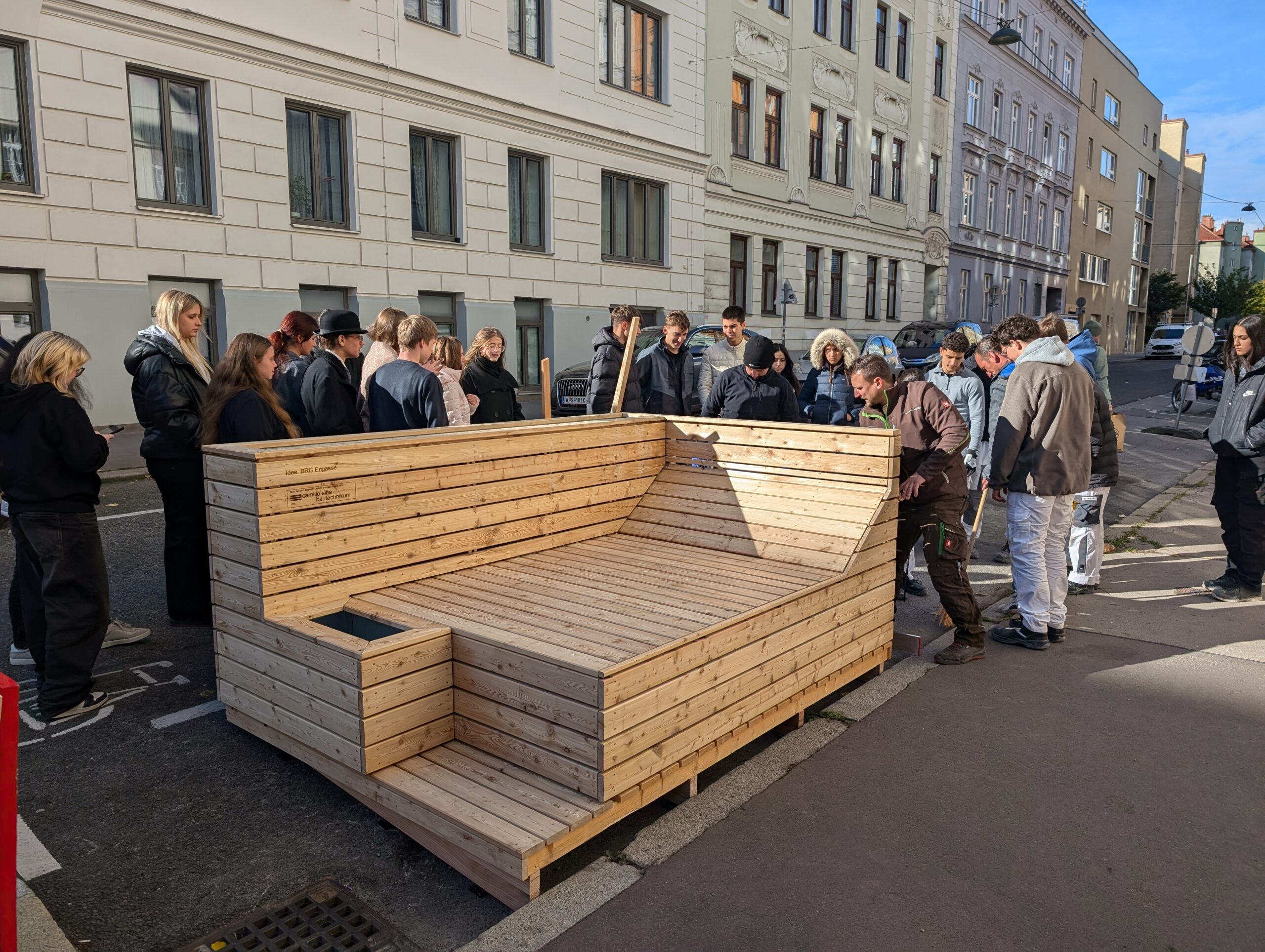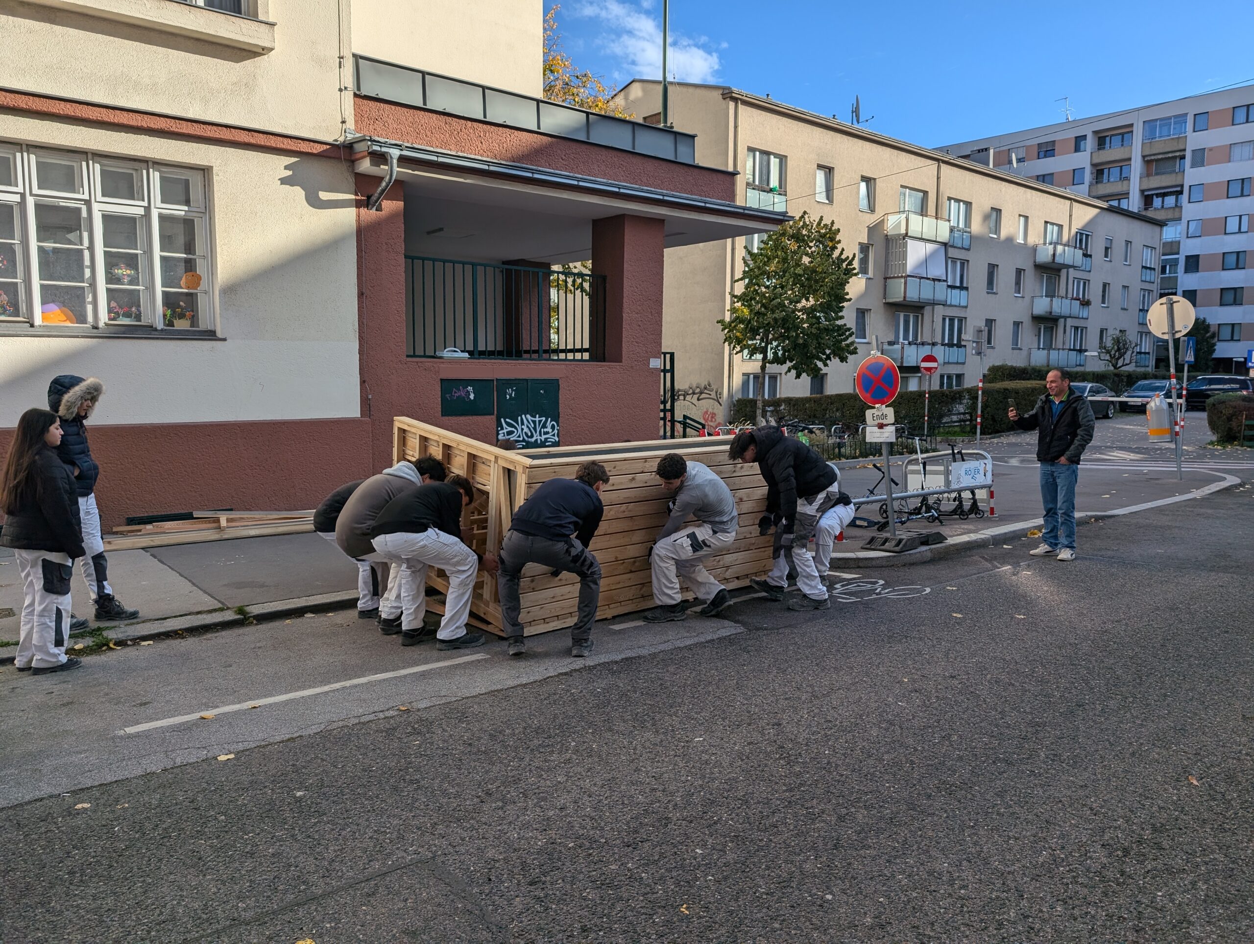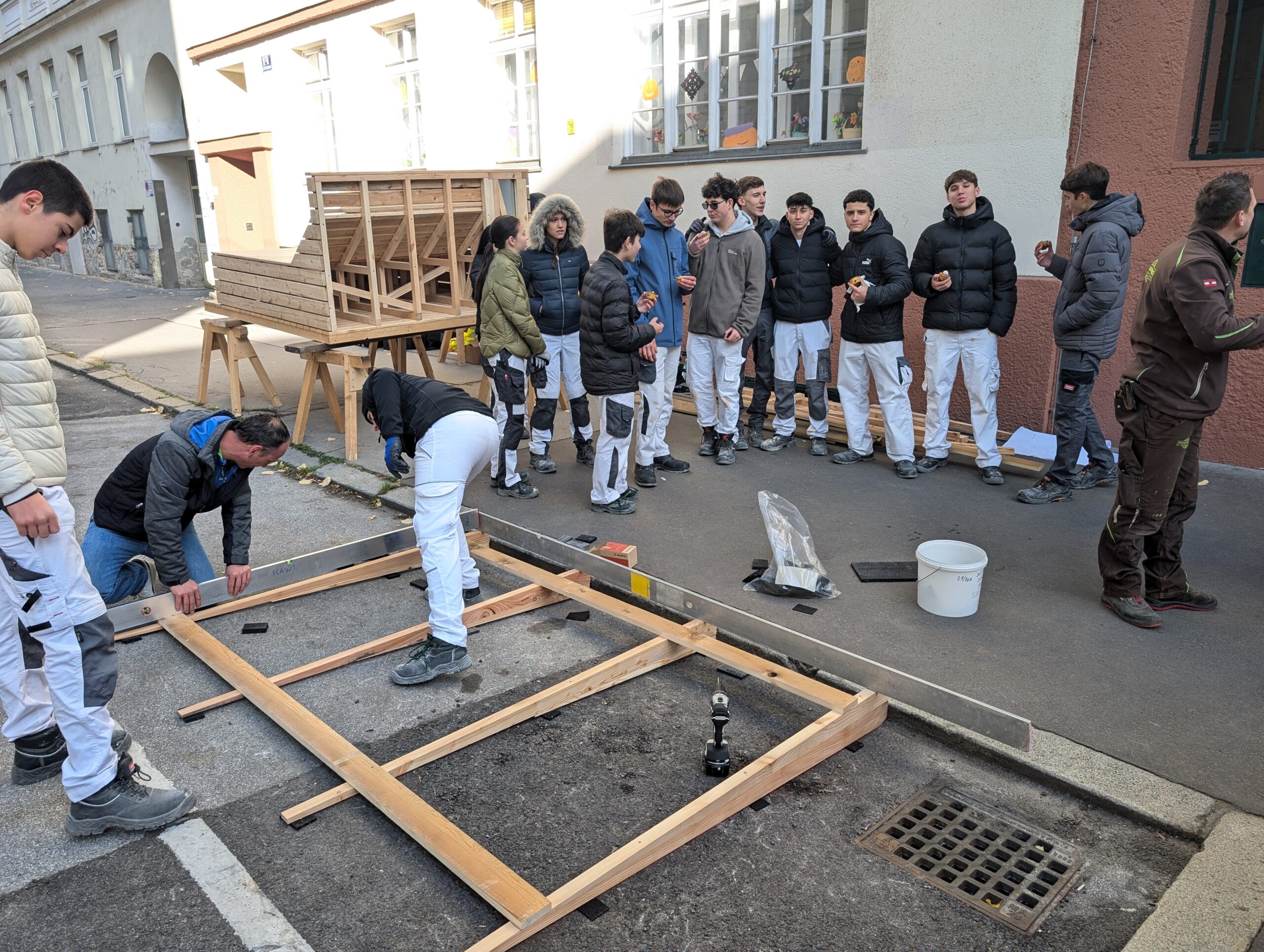 Die Schüler:innen und Lehrer des Camillo Sitte Bautechnikums haben mit großem Engagement und viel Einsatz die Oase nach den Entwürfen von Sara und den Ideen ihrer Klassenkolleg:innen in der 8B umgesetzt. Ende Oktober wurde sie schließlich professionell aufgebaut – ein großartiges Gemeinschaftsprojekt, auf das wir sehr stolz sind.