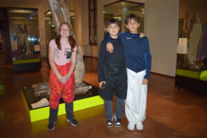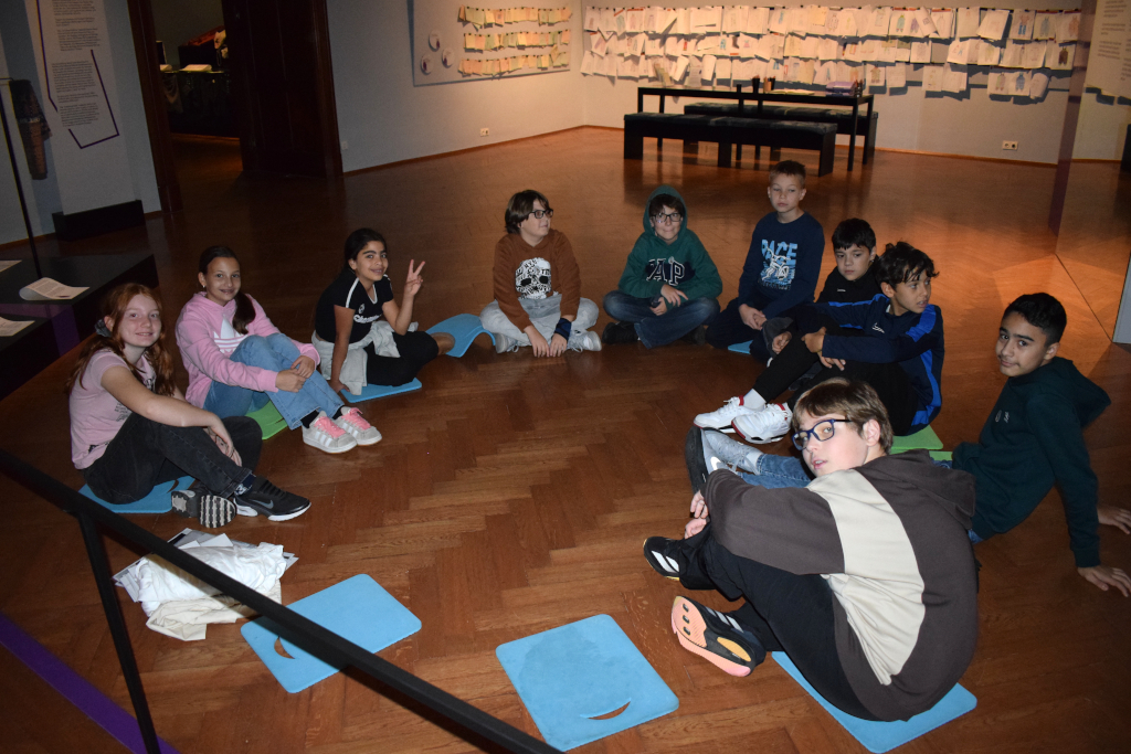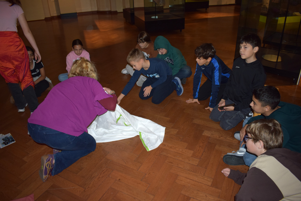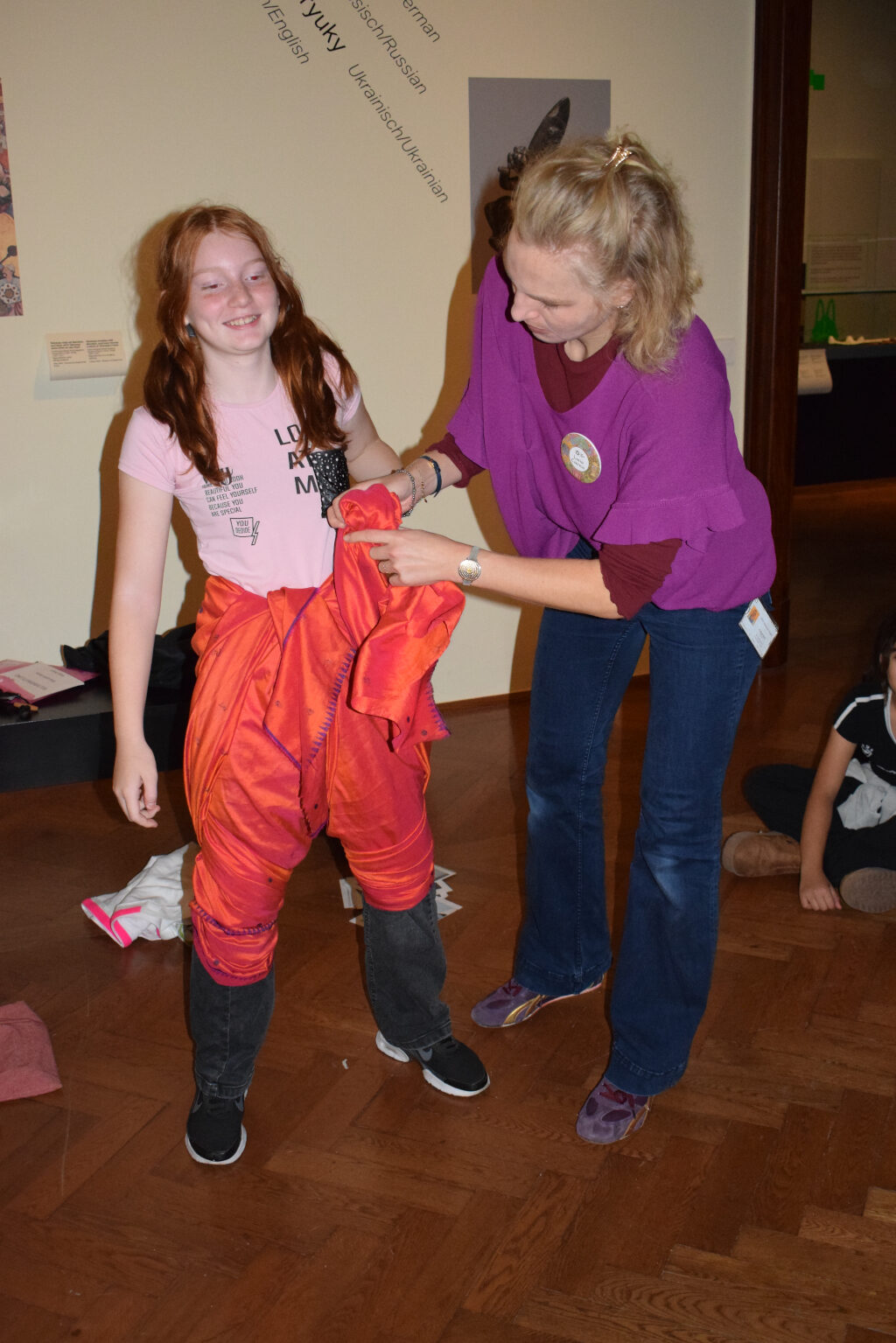 Dann ging es ans Experimentieren und noch weiter in der Geschichte zurück. Wir durften nämlich die ersten Hosen aus einfachen Tüchern nachbinden. So halfen sich frühe Reitervölker, denn ohne Hosen sitzt es sich auf Pferden nicht so gut. – Auch wenn die schon früher gebräuchlichen Röcke Männern ebenso gut standen wie Frauen.