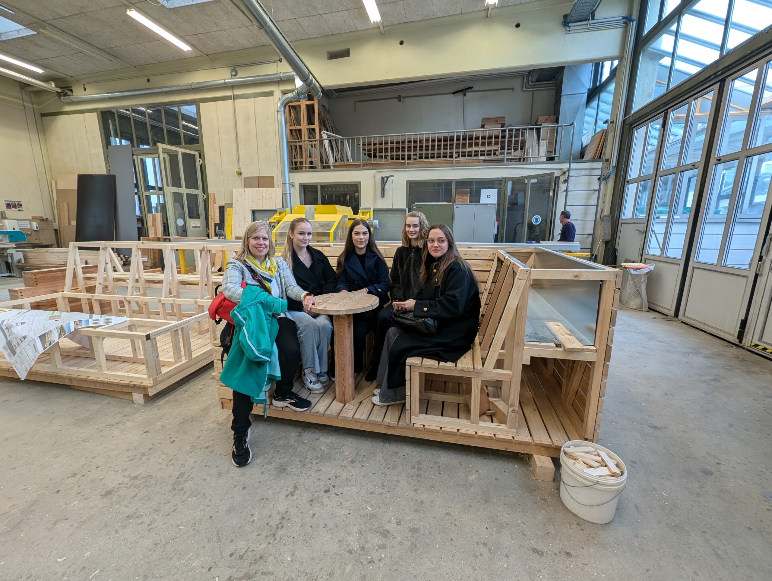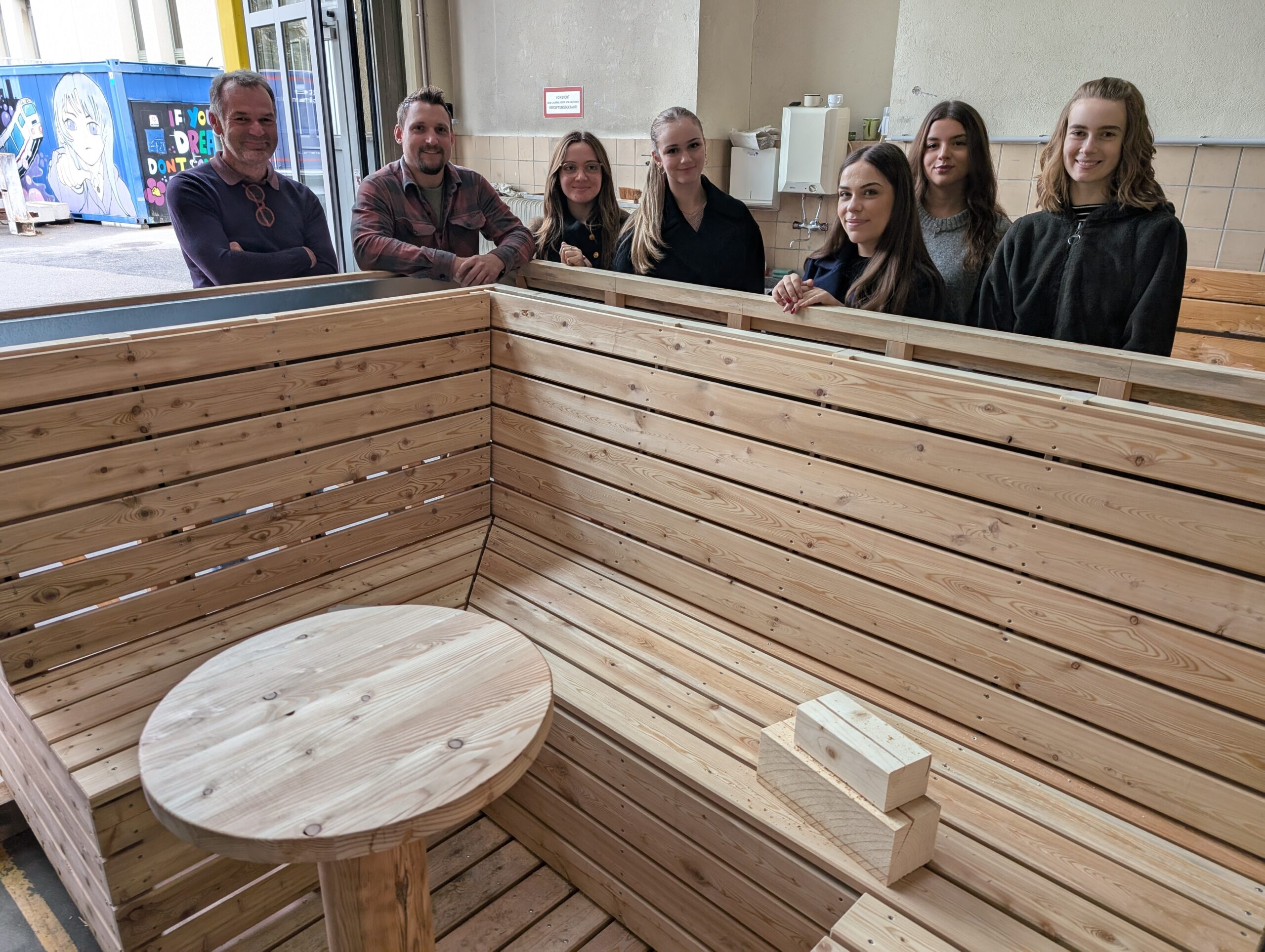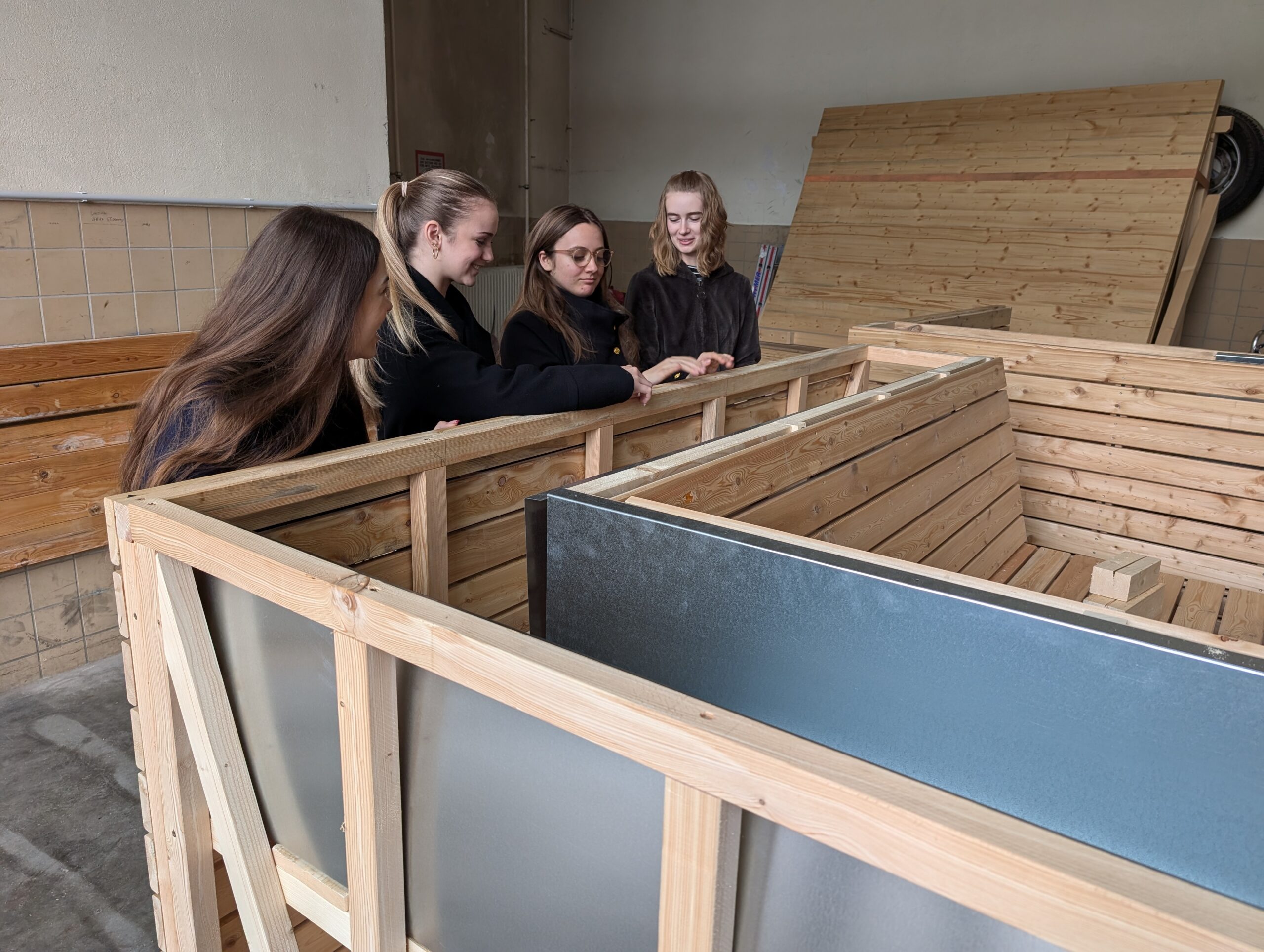 Es ist bald so weit: unsere Grätzloase OasERL ist kurz vor der Fertigstellung und soll ab 20. Oktober aufgebaut werden, davor wollte das Team Grätzloase dem Camillo-Sitte-Bautechnikum noch einen Besuch abstatten. Bauhofleiter DI Markus Berger ermöglichte uns einen Einblick in den Baufortschritt und führte uns durch die Werkstätte. Sara, Elena, Emily und Dilara aus der 8B kamen gemeinsam mit Prof. Seidl als Erste in den Genuss, es sich im OasERL gemütlich zu machen. Die Ausführung in naturbelassenem Lärchenholz ist ein Traum, die Verarbeitung großartig und die Schülerinnen begutachteten ihren Entwurf sehr liebevoll.