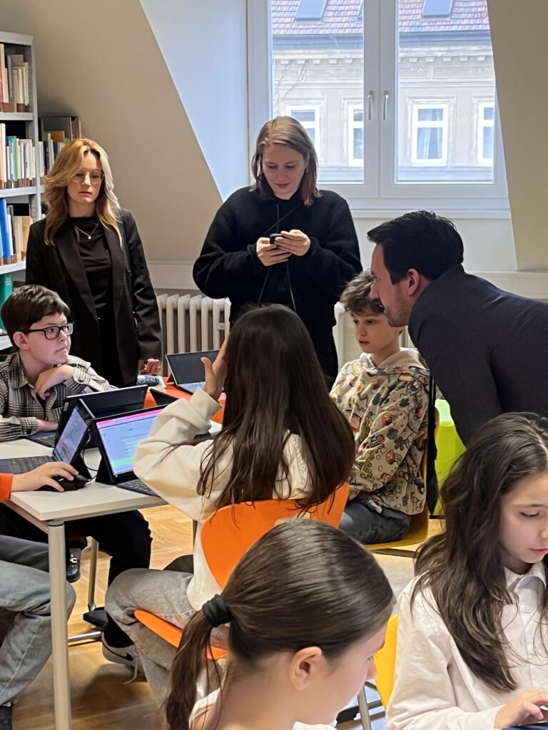 Schüler:innen der 1A, 1B und 5B zeigten sich als Expert:innen und erklärten dem Bildungsminister, wie sie mit diesen digitalen Anwendungen umgehen. Dieser hörte den Kindern aufmerksam zu und zeigte sich von Kenntnissen unserer Schüler:innen beeindruckt.