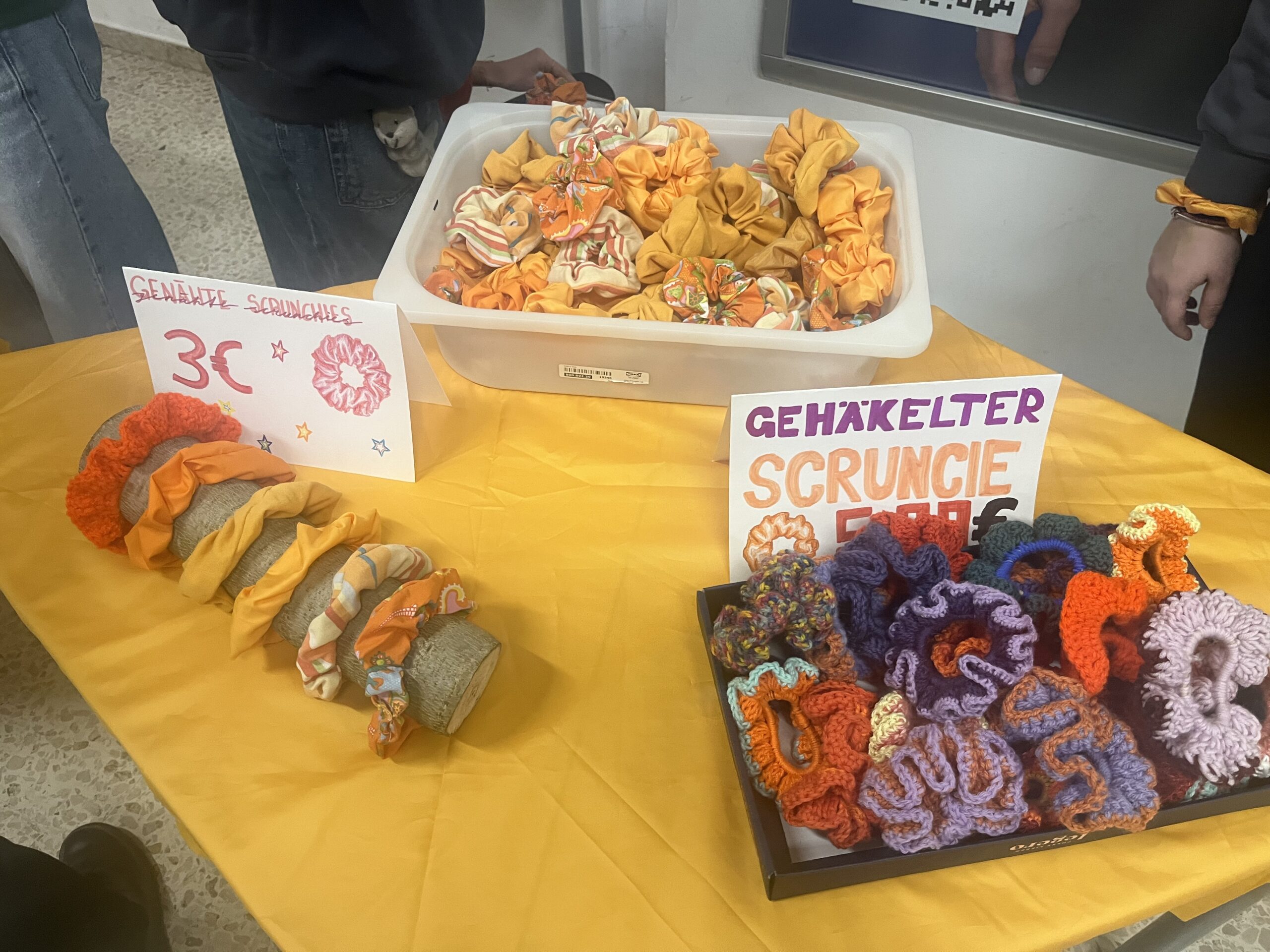 Als Erstes wurden wir von unseren Professoren in zwei verschiedene Gruppen eingeteilt. Unsere Gruppe stellte Produkte für den Verkaufsstand her. Wir haben orangefarbene Scrunchies genäht und Buttons mit feministischen Designs bedruckt. Nachdem wir hundert Scrunchies genäht und 15 gehäkelt hatten, haben wir begonnen, Papierflaggen mit feministischen Sprüchen zu verschönern. Am zweiten Projekttag haben wir Preisschilder gemalt und alles für den Verkauf am folgenden Montag hergerichtet. Am Tag des Verkaufs platzierten wir unsere Produkte und eine auf Zetteln auszufüllende Schnitzeljagd auf Tischen vor dem Festsaal. Nach und nach kamen Klassen hinunter, begutachteten das Projekt der anderen Gruppe und konnten bei uns die zuvor hergestellten Artikel kaufen sowie gratis an der Schnitzeljagd teilnehmen. Insgesamt haben wir mit dem Buffet 750 Euro verdient, die dann an Frauenhäuser gespendet wurden.