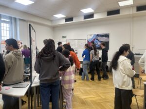 Am Tag der Ausstellung erwachte das Projekt schließlich zum Leben. Die Schüler:innen betreuten ihre jeweiligen Stände selbstständig, präsentierten ihre Ergebnisse und standen dem Publikum für Fragen und Diskussionen zur Verfügung. Gleichzeitig sorgte eine spezielle Kreativgruppe für einen weiteren Höhepunkt: Sie bot während der Veranstaltung selbst hergestellte Produkte zum Verkauf an.