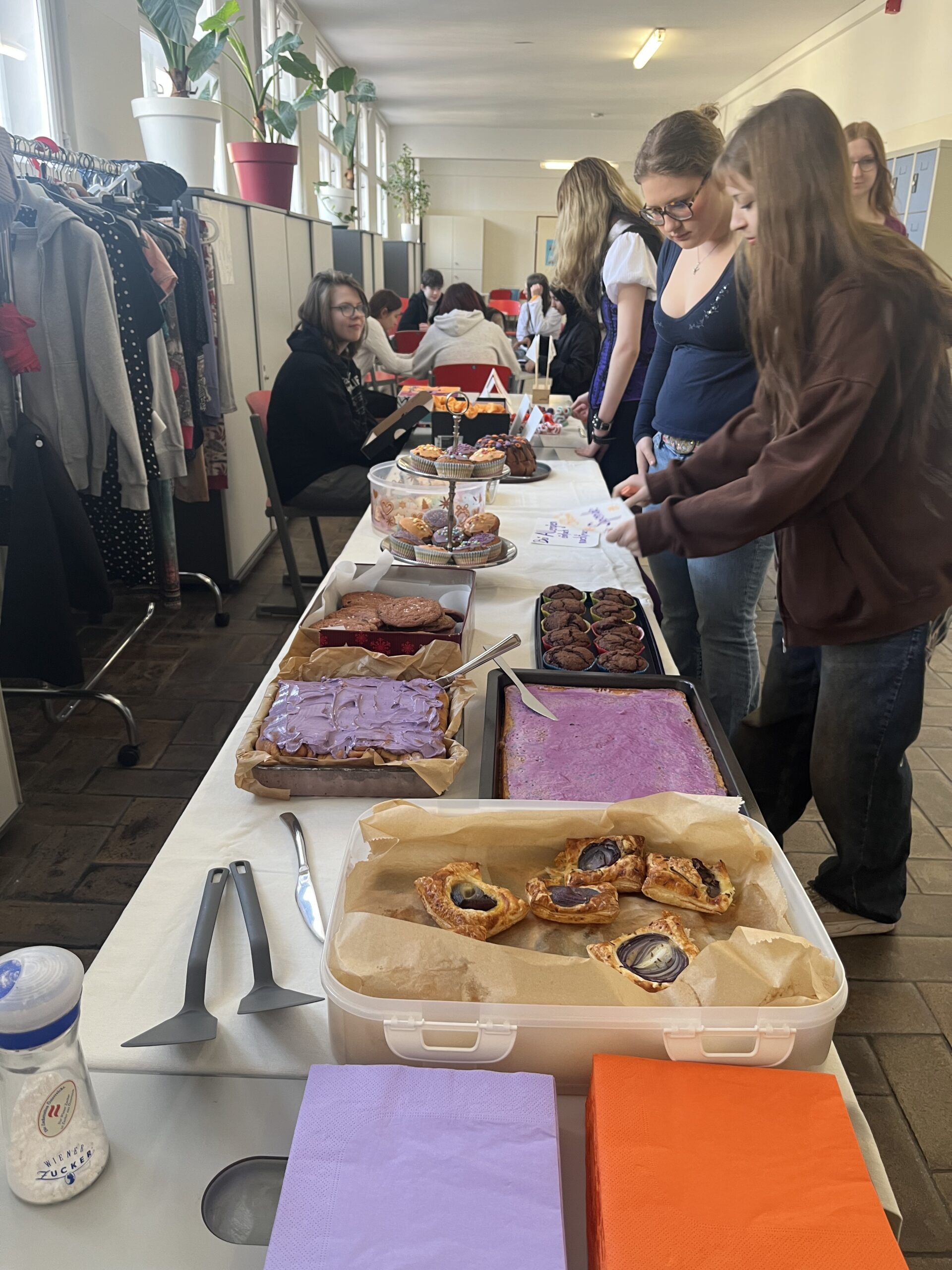 Zusätzlich organisierten die Mitglieder der Gruppe „Let’s talk about feminism“, bestehend aus Schüler:innen der 7A und der 7B, ein köstliches Buffet – ganz in den Farben Lila, der Farbe der Suffragetenbewegung, und Orange, der Farbe gegen Gewalt an Frauen, gehalten.