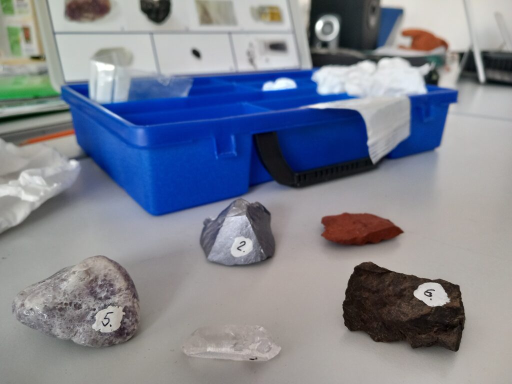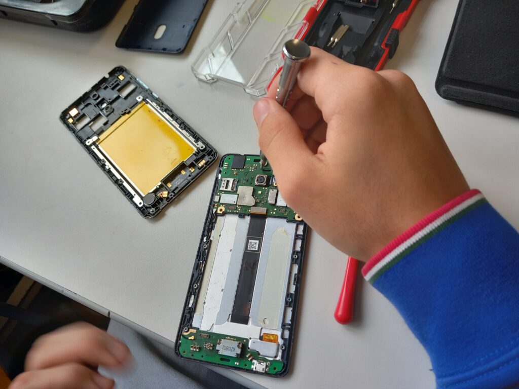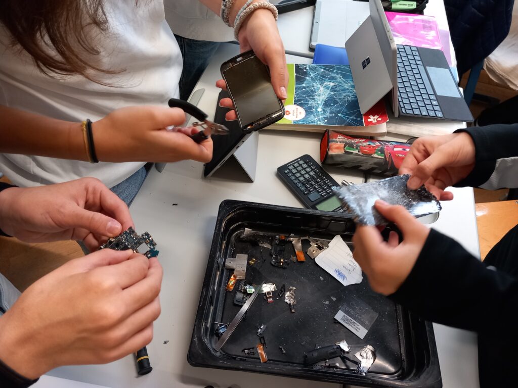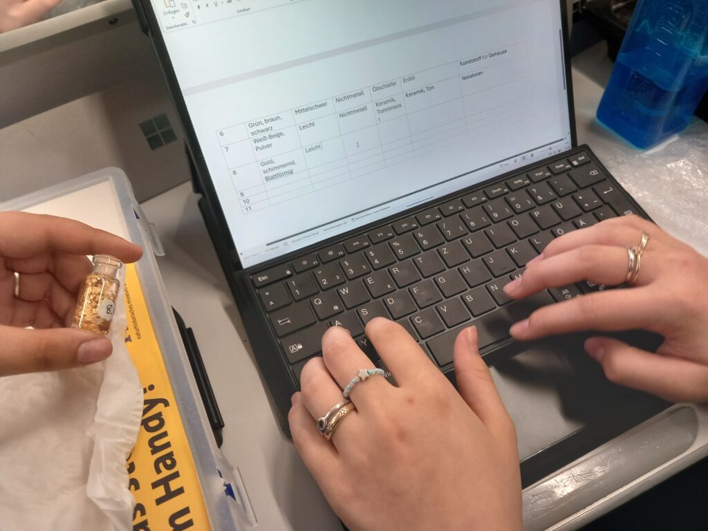 Wir – die 4. Klassen – haben im Digi-Unterricht kaputte Smartphones gesammelt und in Gruppenarbeit zerlegt. Dabei begaben wir uns auf die Suche nach den Materialien und Rohstoffen, die in den Geräten stecken. Der Rohstoffkoffer des Naturhistorischen Museums half uns dabei diverse Metalle, leitende und nichtleitende Materialien, Glas oder Kunststoff zu entdecken. Viele Materialien, auf die wir so stießen, konnten wir zuordnen. Im Rohstoffkoffer fanden wir Proben der Erze oder Mineralien, wie sie in der Natur vorkommen. Wir erfuhren, dass die wertvollen Stoffe wie Aluminium, Silizium, Lithium, Kuper oder sogar Gold unbedingt recycelt werden sollten. Daher wurde der Schrott zum Schluss fachgerecht beim Mistplatz entsorgt.